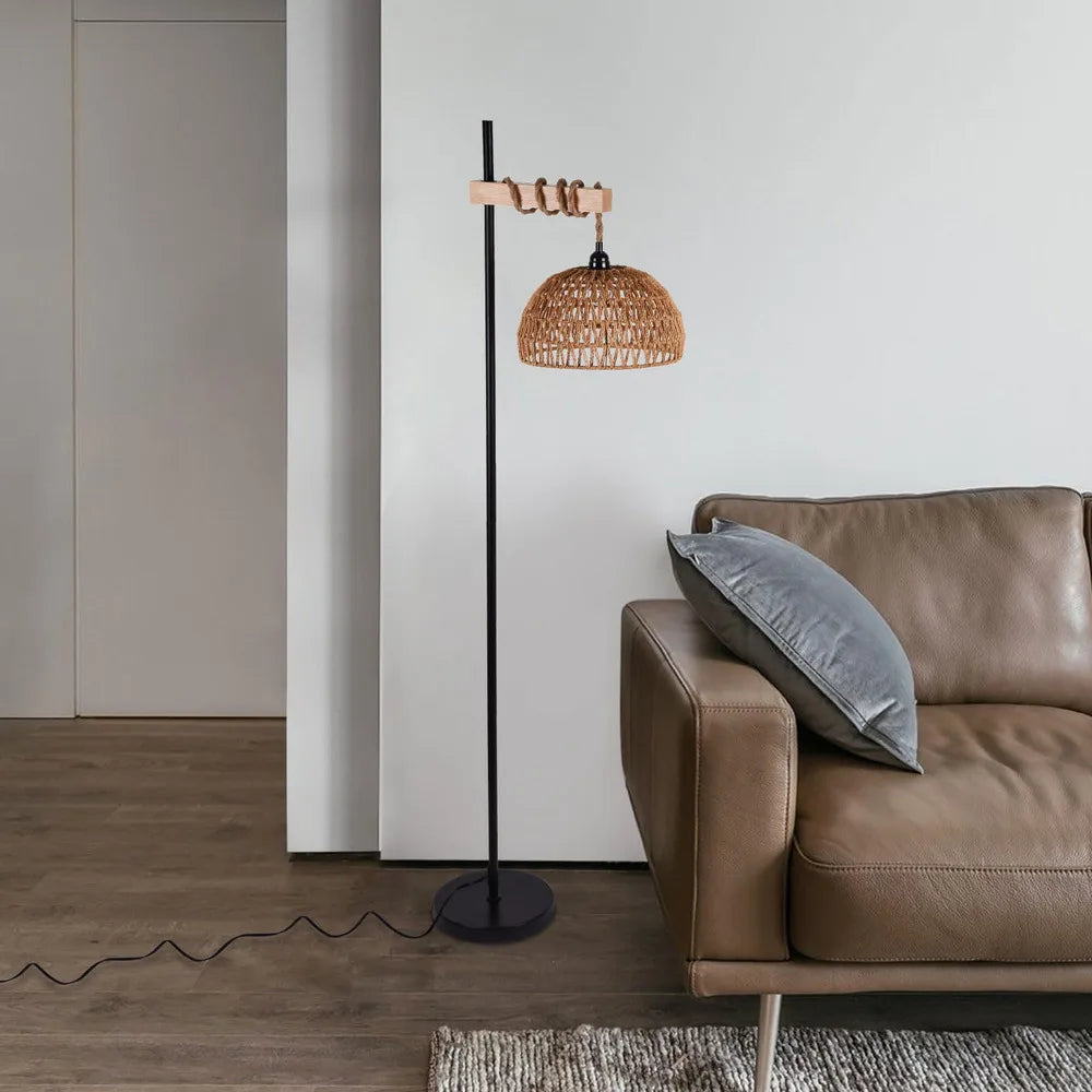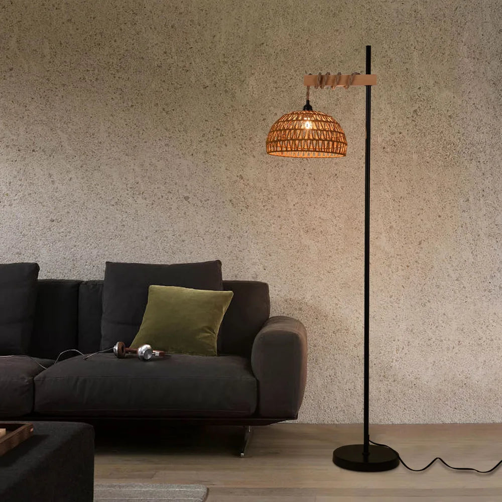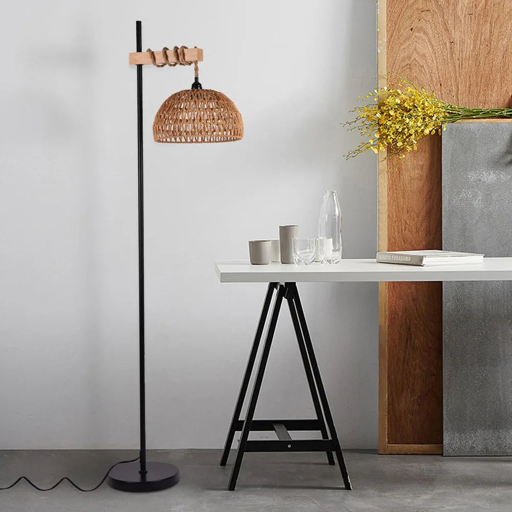 Durable metal frame with a woven rattan lampshade for a warm, organic look.